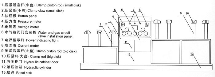 (4)點動夾緊爪,夾緊被測蝶閥(法蘭或平面);(5)按增壓扭至所需壓力(夾緊油缸所需壓力對照表)(貼在機上)。增壓按鈕可多次點動,每次間隔若三秒鐘左右, (指第一次按下未達到所需壓力時)。最高壓力32MPa;(6)進行水壓或氣壓對被試蝶閥進行測試;(7)測試完 畢后,打開放水或氣開關,泄掉壓力即可; (8)先后按各放松鈕,將被測閥門取下。